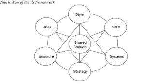 The seven variables include structure, strategy, systems, skills, style, staff, and shared values. Structure is defined as the skeleton of the organization or the organizational chart. The authors describes strategy as the plan or course of action in allocating resources to achieve identified goals over time. The systems are the routinized processes and procedures followed within the organization. Staff are described in terms of personnel categories within the organization (e.g., engineers), whereas the skills variable refers to the capabilities of the staff within the organization as a whole. The way in which key managers behave in achieving organizational goals is considered to be the style variable; this variable is thought to encompass the cultural style of the organization. The shared values variable, originally termed superordinate goals, refers to the significant meanings or guiding concepts that organizational members share.