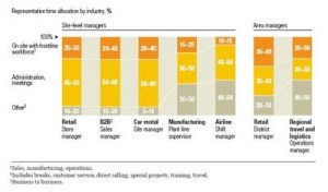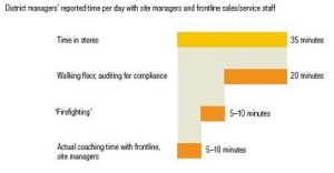 To unlock a team’s abilities, a manager at any level must spend a significant amount of time on two activities: helping the team understand the company’s direction and its implications for team members and coaching for performance. Little of either occurs on the front line today. Across industries, frontline managers spend 30 to 60 percent of their time on administrative work and meetings, and 10 to 50 percent on nonmanagerial tasks (traveling, participating in training, taking breaks, conducting special projects, or undertaking direct customer service or sales themselves). They spend only 10 to 40 percent actually managing frontline employees by, for example, coaching them directly (Exhibit 1). Even then, managers often aren’t truly coaching the front line. Our survey of retail district managers, for example, showed that much of the time they spend on frontline employees actually involved auditing for compliance with standards or solving immediate problems (Exhibit 2). At some companies we surveyed, district managers devote just 4 to 10 percent of their time—as little as 10 minutes a day—to coaching teams. To put the point another way, a district manager in retailing may spend as little as one hour a month developing people in the more junior but critical role of store manager.